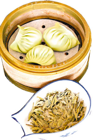 橙紅間白的蝦仁餡料,在綠油油、均勻透亮的餃子皮呵護(hù)下,像龍井茶一樣顯得更加嬌嫩,而且口感爽滑、鮮甜,淡淡的龍井清香纏繞在口腔中。