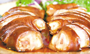 這道菜顏色誘人,做法也不會特別復(fù)雜。只要以豬手為原料,在傳統(tǒng)的鹵水上加入普洱茶葉,浸鹵2個小時而成。據(jù)何劍峰說,茶葉含有茶堿,茶堿能去肥膩,也增加了肉質(zhì)的爽滑度。