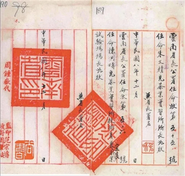 1919年12月,云南省長公署任命朱文精為茶業(yè)實習所所長的委任狀