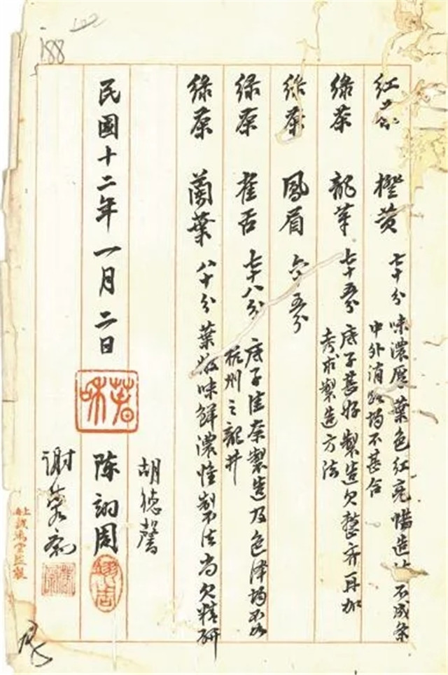 1922年11月,朱文精將實習所焙制的5種茶樣交實業(yè)司,轉(zhuǎn)送上??偵虝诱垖<以u定。擔任上海總商會展覽會茶葉審查員的胡德馨、陳翊周、謝蓉齋3位茶業(yè)專家在詳細查驗品評茶樣后,聯(lián)合出具了報告書。報告書記載,5份茶樣,合紅茶1份,綠茶4份,分別是橙黃、龍華、鳳眉、雀舌、蘭葉。其中蘭葉“葉嫩味鮮濃”得分最高,獲得80分??傮w來看,專家們認為茶業(yè)實習所送評的茶葉,無論紅茶還是綠茶,茶葉的底子都好,但制法上尚欠精研,還需提高。