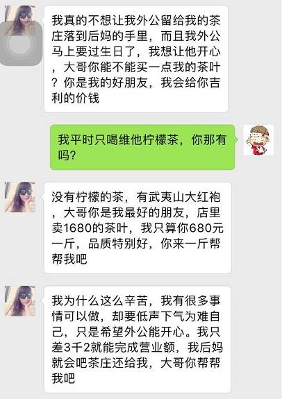 這個(gè)時(shí)候,騙子十有八九會(huì)出現(xiàn)跟你說失戀的情況,哭的傷心欲絕,然后跟你傾訴,讓你憐香惜玉,之后會(huì)跑到武夷山爺爺奶奶或者外公外婆家中療傷,幫忙種茶炒茶,學(xué)會(huì)炒茶葉后決定自立自強(qiáng),開創(chuàng)自己的事業(yè) —— 炒茶葉,賣茶葉。