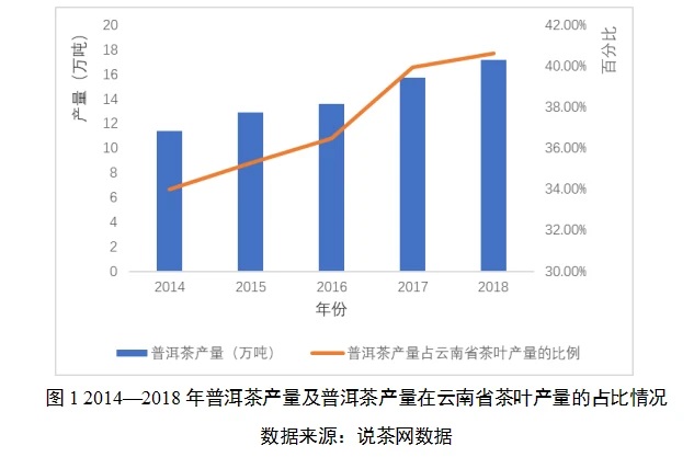 (一)產(chǎn)量持續(xù)增加近五年來(lái),普洱茶產(chǎn)量呈持續(xù)增加的趨勢(shì),從2014年的11.4萬(wàn)噸增長(zhǎng)到2018年的17.2萬(wàn)噸;普洱茶占比也不斷提高,從2014年的34.0%提高到2018年的40.6%。