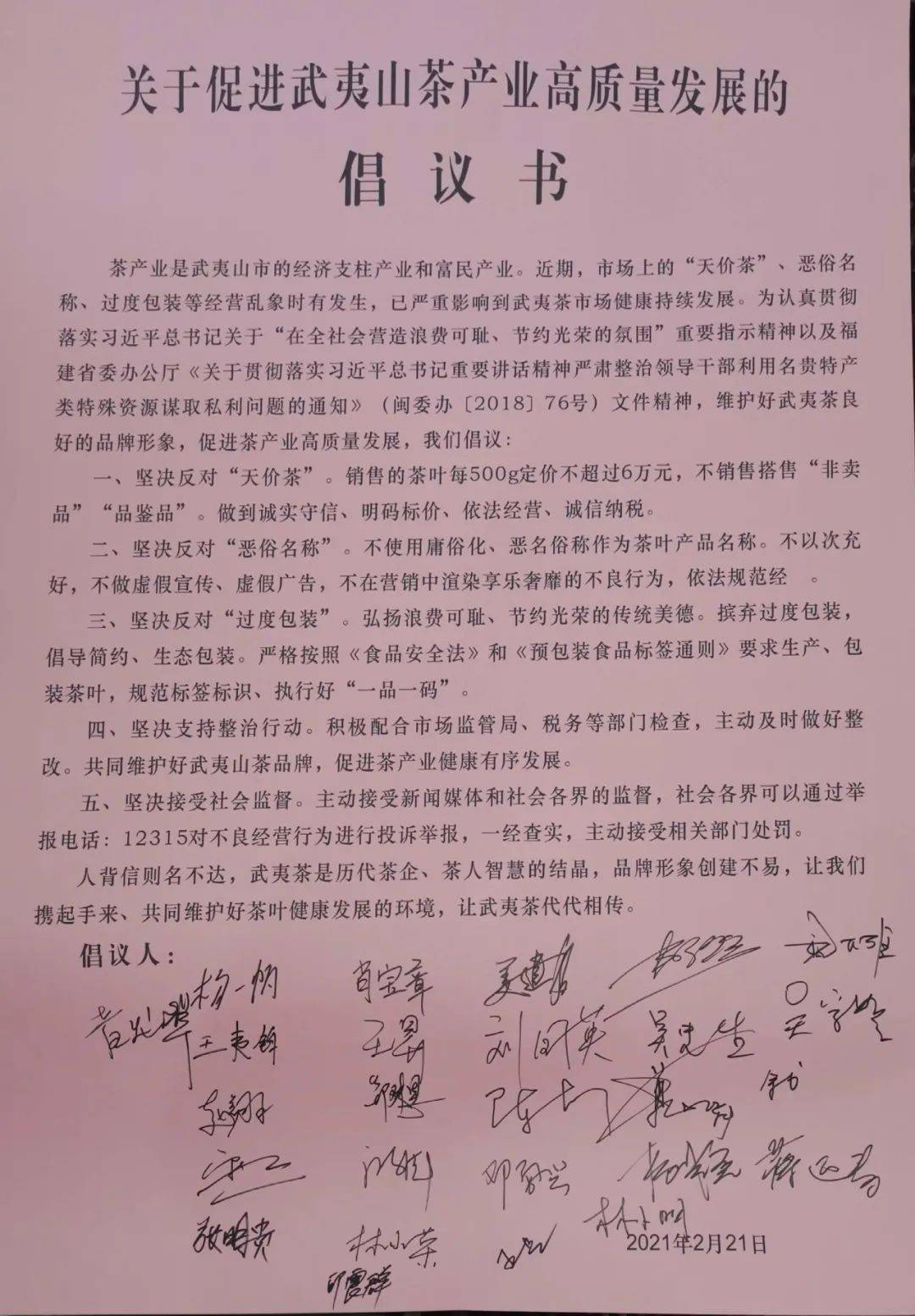 2月21日下午,武夷山市召開(kāi)促進(jìn)茶葉市場(chǎng)健康發(fā)展推進(jìn)會(huì),26家曾出現(xiàn)在網(wǎng)傳“天價(jià)茶”榜單上的武夷山茶企負(fù)責(zé)人共同簽署《關(guān)于促進(jìn)武夷山茶產(chǎn)業(yè)高質(zhì)量發(fā)展的倡議書(shū)》,堅(jiān)決反對(duì)“天價(jià)茶”,堅(jiān)決反對(duì)“惡俗名稱(chēng)”、“過(guò)度包裝”,承諾不做虛假宣傳,規(guī)范經(jīng)營(yíng)管理,不銷(xiāo)售“非賣(mài)品”“品鑒品”,自覺(jué)接受監(jiān)督,如有違法違規(guī)行為,一經(jīng)查實(shí),主動(dòng)接受相關(guān)部門(mén)處罰。
