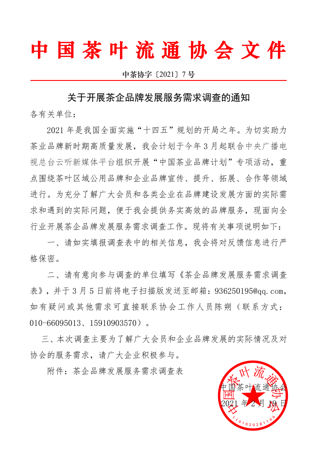 中國茶葉流通協(xié)會關于開展茶企品牌發(fā)展服務需求調(diào)查的通知