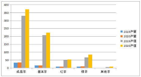 圖11  2019-2020成品茶類(lèi)產(chǎn)量產(chǎn)值比較圖