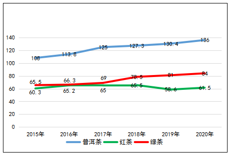 2020年,普洱茶平均單價(jià)139元/千克,比2019年增長(zhǎng)4.3%,紅茶平均單價(jià)61.5元/千克,比2019年增長(zhǎng)4.9%,綠茶平均單價(jià)84元/千克,比2019年增長(zhǎng)3.7%。“十三五”期間,普洱茶、綠茶價(jià)格年均增長(zhǎng)率分別為4.7%、5.1%,均呈穩(wěn)步增長(zhǎng),紅茶年均增長(zhǎng)僅0.4%。