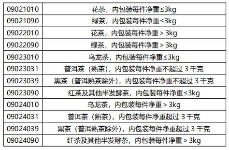 2020年12月,國務(wù)院關(guān)稅稅則委員會對茶葉類進(jìn)出口稅號進(jìn)行了調(diào)整,新增黑茶出口稅號類目,調(diào)整后茶葉進(jìn)出口商品編碼及商品名稱信息如下: