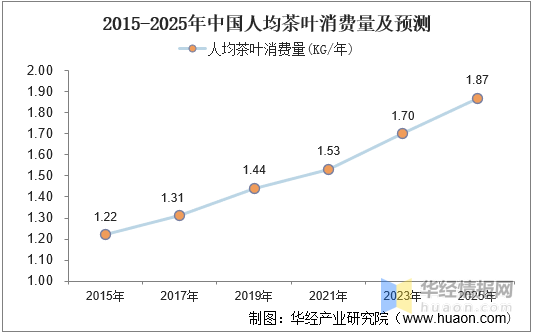 茶始終是中國消費者現(xiàn)制飲料消費的最大品類,茶葉消費市場規(guī)模依然遠高于近年來在中國快速增長的咖啡市場:2019年中國茶葉銷售額達2740億元,遠高于咖啡678億元的市場規(guī)模。從人均茶葉消費量來看,2015-2019年人均消費量持續(xù)增長,由1.22千克/年增長至1.44千克/年,預計未來將維持增長態(tài)勢,2025年可達到1.87千克/年。
