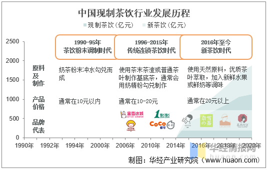 中國現(xiàn)制茶飲行業(yè)走過來三個階段:1990-1995的茶飲粉末調制時代;1996-2015年的傳統(tǒng)連鎖茶飲時代,以蜜雪冰城、一點點、COCO等品牌為代表;2016年至今的新茶飲時代,以奈雪的茶、喜茶、茶顏悅色等品牌為代表。