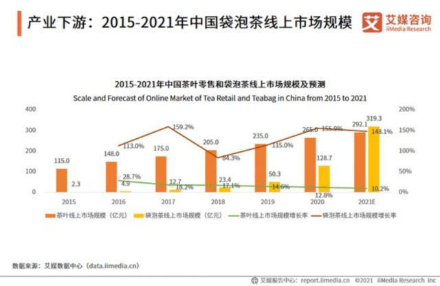 產(chǎn)業(yè)下游:2015-2021年中國(guó)袋泡茶線上市場(chǎng)規(guī)模