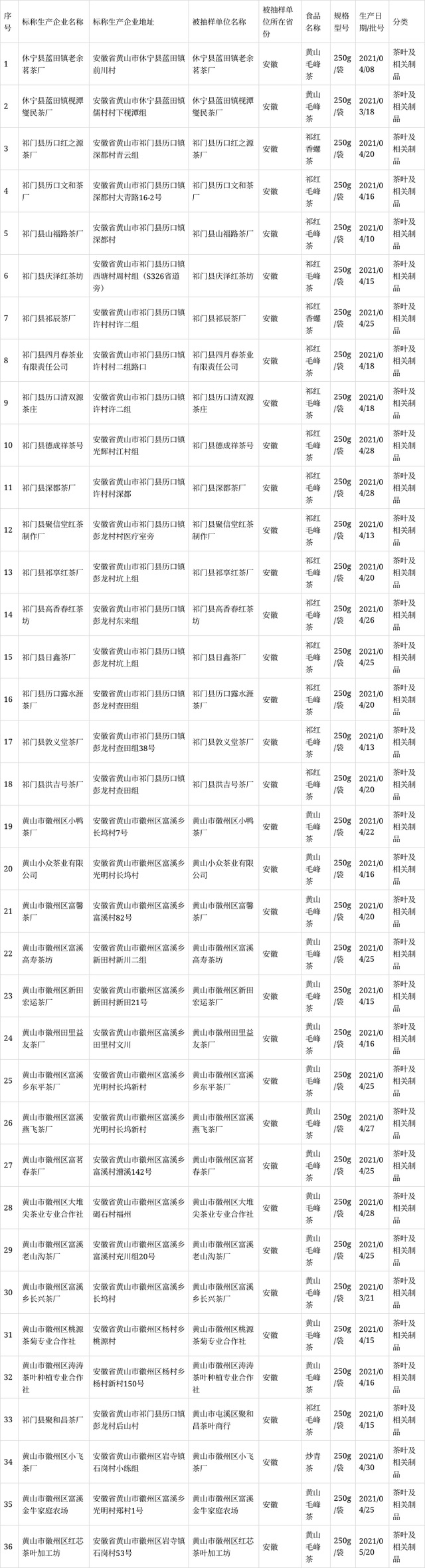 安徽省黃山市市場監(jiān)管局公布36批次茶葉及相關制品抽檢結果