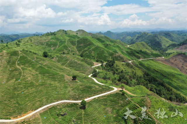 產(chǎn)業(yè)路下方,20來(lái)名群眾正在躬身勞作,下苗、覆土,一株株茶苗便種植完成。剛種下的低矮茶苗,與產(chǎn)業(yè)路上方郁郁蔥蔥的茶山形成強(qiáng)烈反差。