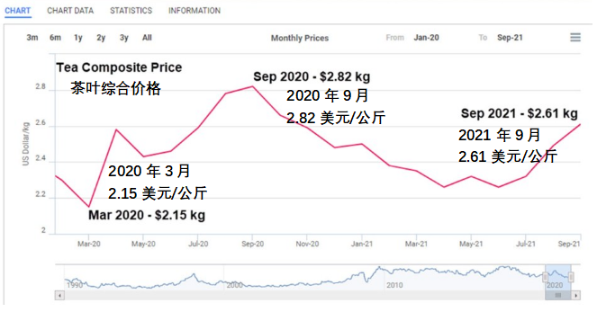 從產(chǎn)茶區(qū)域來(lái)看,茶葉價(jià)格趨勢(shì)喜憂參半。印度茶葉產(chǎn)量占到全球的20%。2021年9月份,印度茶葉出口量下降10%,但出口金額上漲。印度報(bào)告稱,在疫情爆發(fā)的一年里,印度本土茶葉價(jià)格下跌, 2021年上半年價(jià)格上漲。11月,加爾各答的紅碎茶拍賣價(jià)格降至2.78美元/公斤,2020 年同期為2.97美元/公斤。